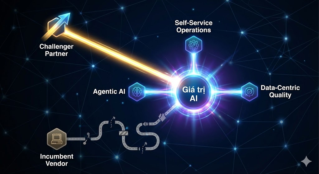 Cuộc cách mạng AI đã bước vào một giai đoạn mới. Lợi thế không còn nằm ở việc sở hữu công nghệ, mà là ở khả năng triển khai nó một cách chiến lược để tạo ra các mô hình hoạt động vượt trội. Trong bối cảnh này, việc bám víu vào các đối tác công nghệ lớn, truyền thống—những người đang chật vật bắt kịp thông qua M&A và các kiến trúc chắp vá—không còn là một lựa chọn an toàn, mà là một canh bạc rủi ro. Tương lai thuộc về những người táo bạo: những nhà lãnh đạo dám hợp tác với các đối tác ‘challenger’—những người được sinh ra trong kỷ nguyên AI, có kiến trúc linh hoạt, và tập trung vào việc tạo ra các ‘hệ thống hành động’ mang lại ROI gấp 10 lần. Bằng cách ưu tiên các tiêu chí như kiến trúc sẵn sàng cho tương lai, sự tương đồng về chiến lược đổi mới, và một mô hình hoạt động đồng sáng tạo, doanh nghiệp của bạn có thể xây dựng một lợi thế cạnh tranh bền vững. Đã đến lúc xem việc lựa chọn đối tác AI không phải là một quyết định mua sắm, mà là một trong những động thái chiến lược quan trọng nhất mà bạn sẽ thực hiện trong thập kỷ này.