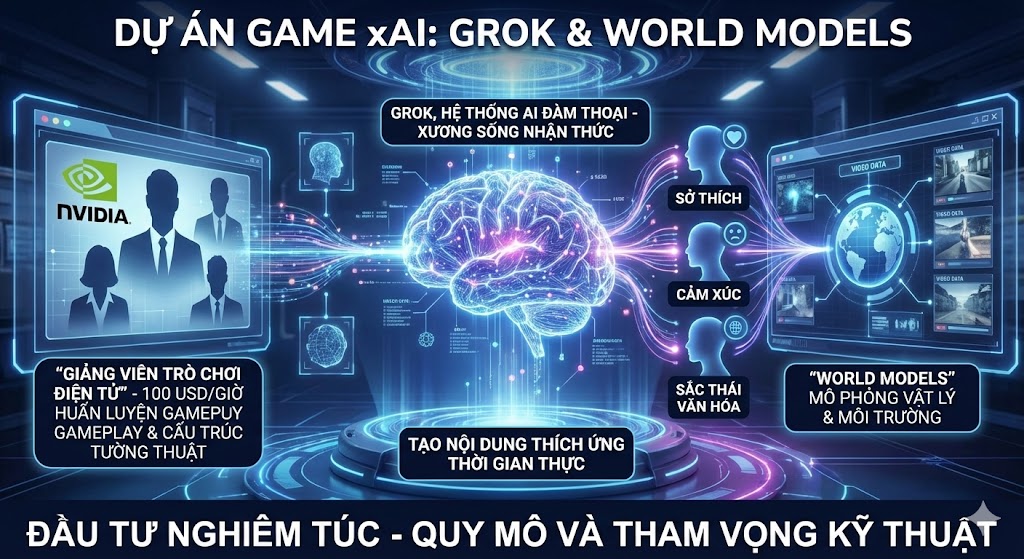Trái tim của dự án này là Grok, hệ thống AI đàm thoại của xAI, được dùng làm xương sống nhận thức. Grok cho phép các mạng nơ-ron hiểu được sở thích, cảm xúc và các sắc thái văn hóa của con người, giúp AI tạo ra nội dung không chỉ tĩnh mà còn có khả năng thích ứng với hành vi của người chơi trong thời gian thực. Hơn nữa, xAI đang phát triển các ‘world models’—hệ thống mô phỏng vật lý và môi trường thế giới thực bằng cách học từ dữ liệu video. Để hiện thực hóa điều này, công ty đã chiêu mộ các nhà nghiên cứu từ Nvidia và tuyển dụng các ‘giảng viên trò chơi điện tử’ với mức lương 100 USD/giờ để huấn luyện AI về cơ chế gameplay và cấu trúc tường thuật. Sự đầu tư nghiêm túc này cho thấy quy mô và tham vọng kỹ thuật của dự án.