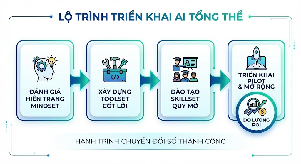 Lộ trình tổng thể: Từ đánh giá Mindset đến đo lường ROI khi triển khai AI